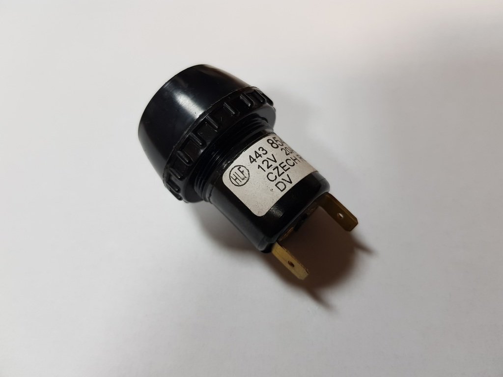 Vestavné kruhové tlačítko československé výroby používané v Karosách řady 700 na přístrojové desce a v motorovém prostoru i u prvních ročníků řady 900. Slouží k testu žárovek ve výstražných kontrolkách na přístrojové desce. Kruhové vestavné provedení, montážní otvor cca 24mm, připojení dva konektory, pro napětí 12 - 24V. Originální následná výroba (výrobce HLF), produktové číslo 443 854 207 000.