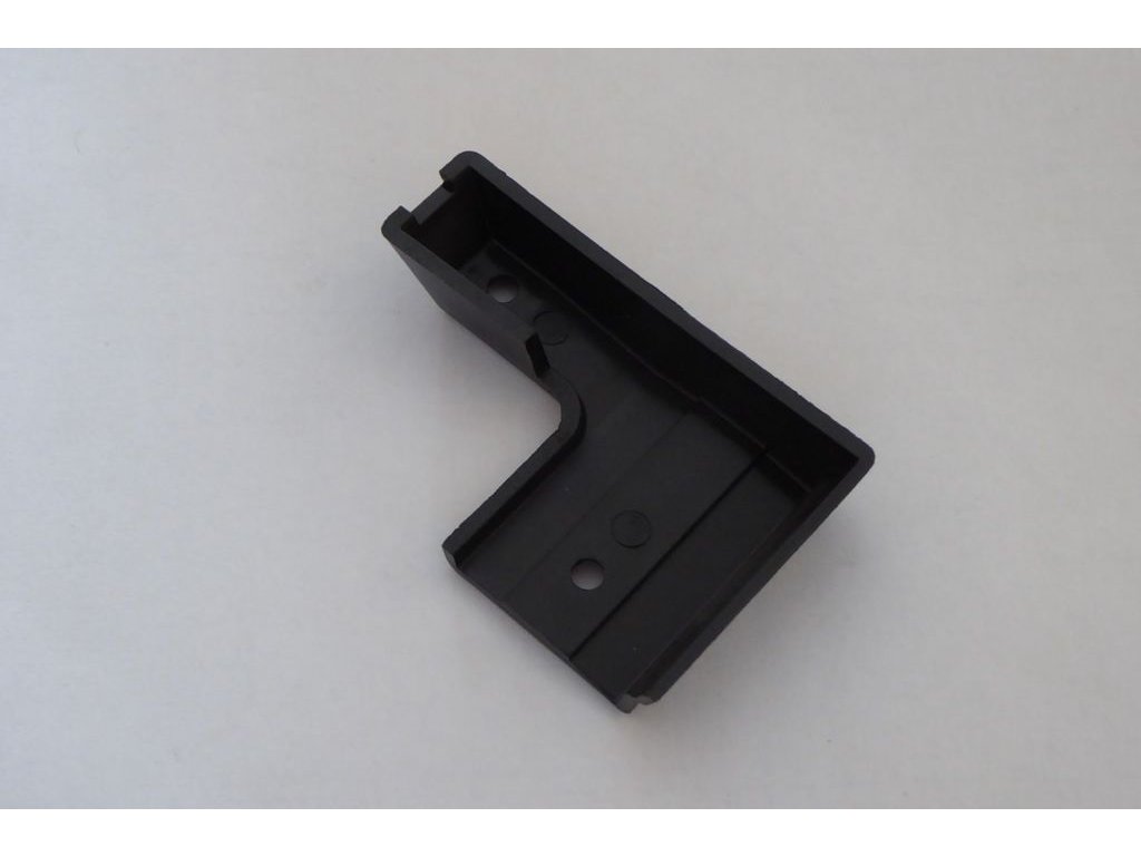 Plastová koncovka krycích hliníkových lišt sloužících k překrytí spojů jednotlivých bočních plechů nebo spojů. Koncovka se umisťuje na samý konec lišty a je připevněna pomocí vrutů skrz otvor do pokladu. Určena na hliníkové lišty a profily šířky 25mm, s vnitřní výplní černou bužírkou. Toto provedení tvaru 'L' je určeno k ukončení profilů pro víka schrán po obou stranách. Novější provedení používané od autobusů Karosa řady 900E (předchozí provedení pouze s jedním otvorem pro vrut). Rozměry cca 40x70mm. Originální výroba. Pouze na PRAVOU stranu.