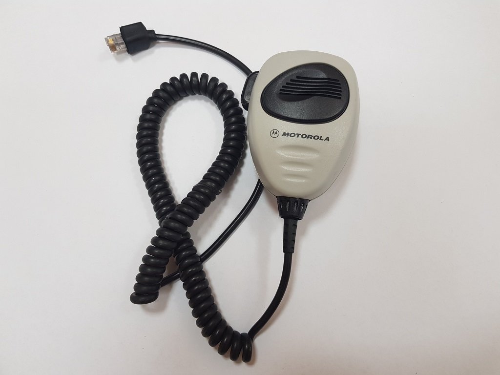 Klasický šňůrový mikrofon radiostanice s tlačítkem přepínání hovoru/poslechu. Výrobce Motorola, typ GMMN 4063A, používané k radiostanicím v DP Praha. Mikrofon je určen u umístění na držák a je osazen na krouceném přívodním kabelu, připojení pomocí datového konektoru do vozu nebo přímo do radiostanice. Různé možnosti použití, prodej ale pouze k dekoračním účelům a funkčnost nelze ověřit. Originální výroba.